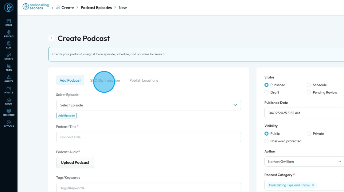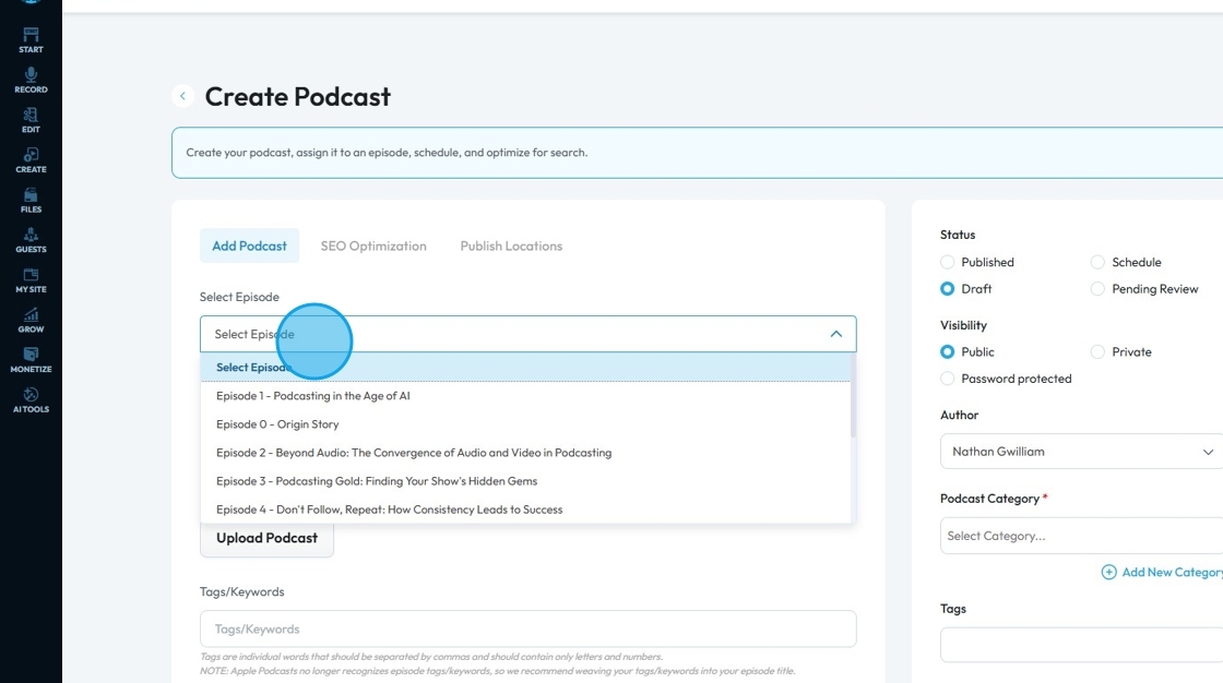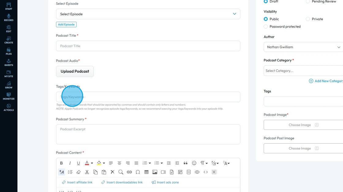 7. Click the "Tags/Keywords" to add tags and keywords to your podcast episode