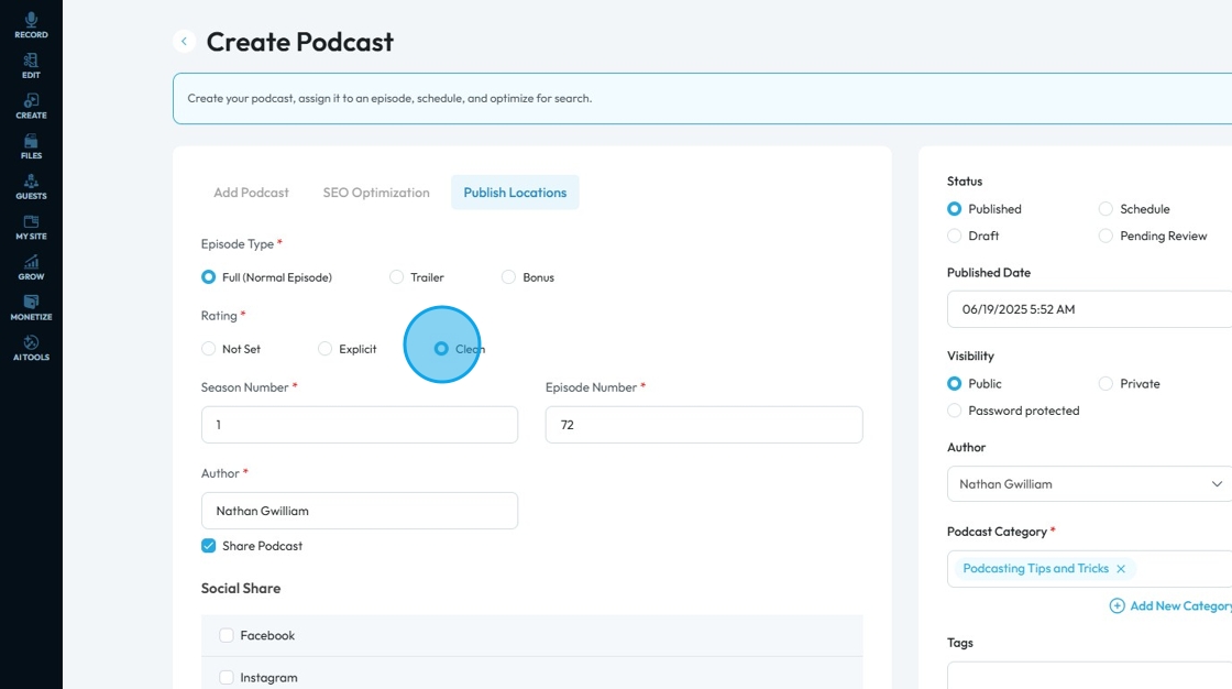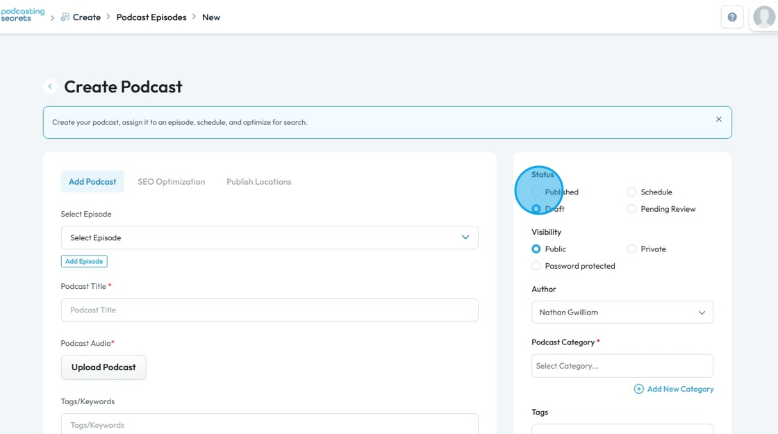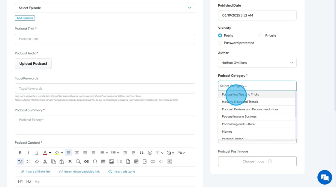 14. Click the "Select Category" to choose the overall topic or theme that the podcast post will fall under