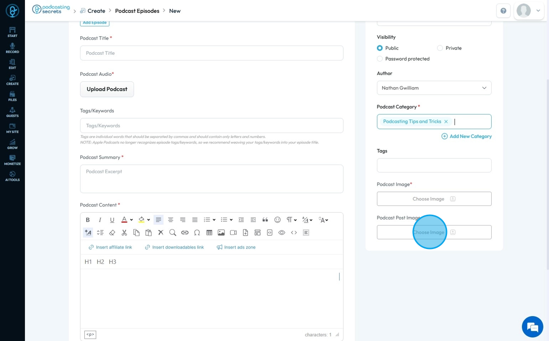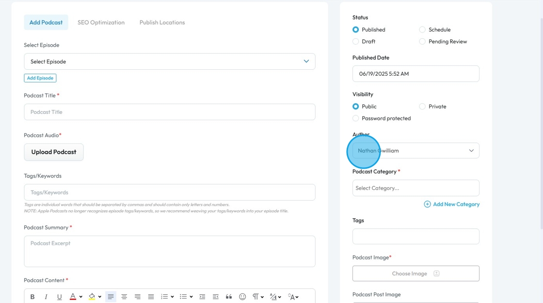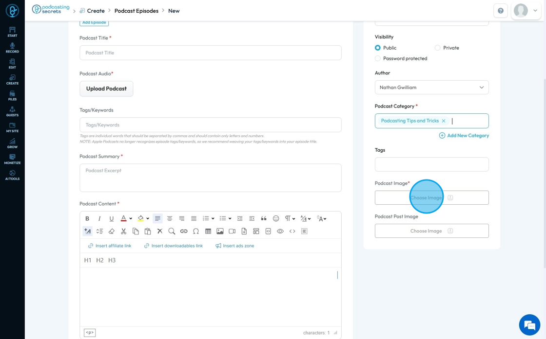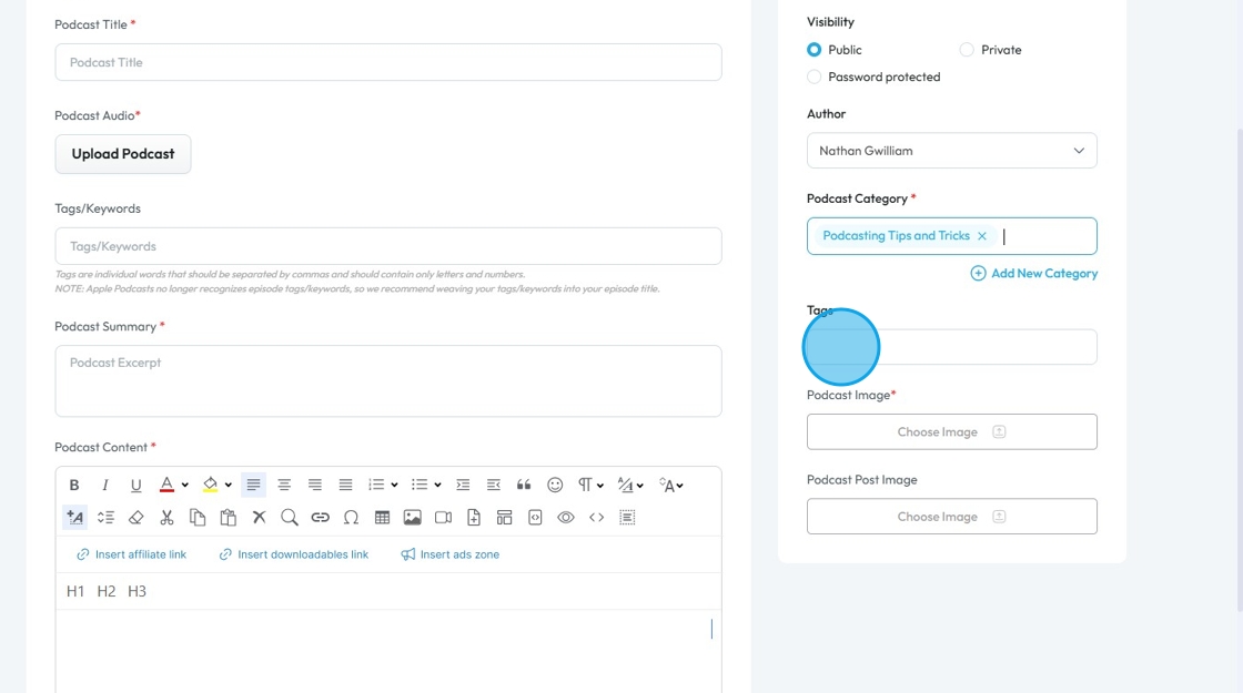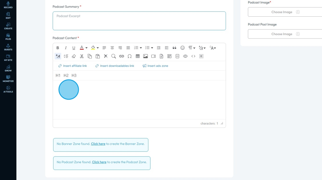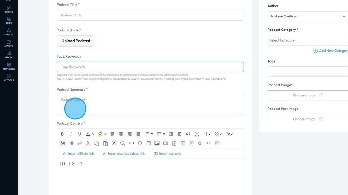 9. Click "Podcast Content" to add a detailed description of the podcast.