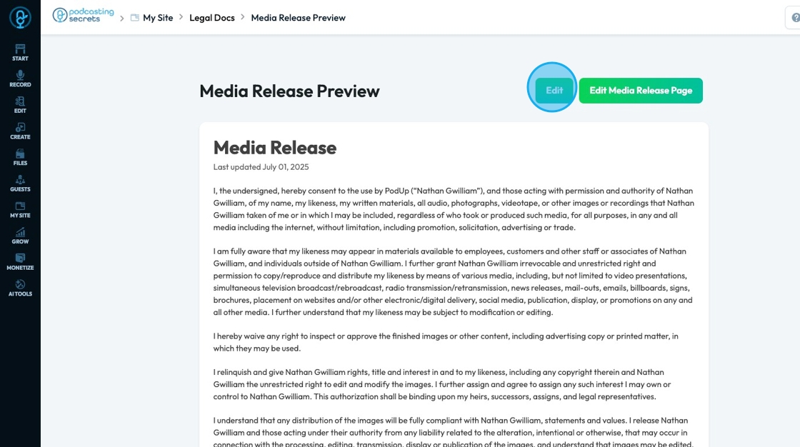 - "Edit Media Release Page": Permits you to edit the website page that contains the policy
