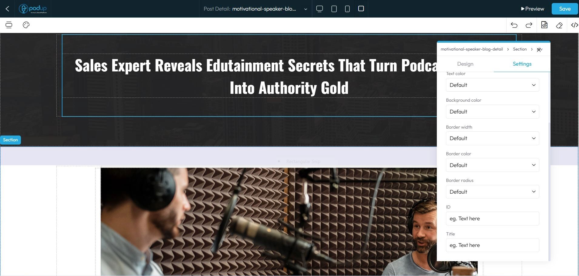 31. Click "Settings" to customize Text color, Background color, Border width, Border color, Border radius, ID and Title