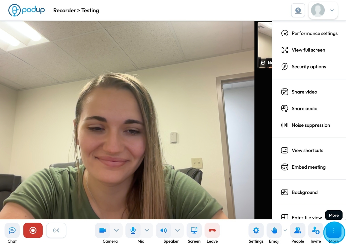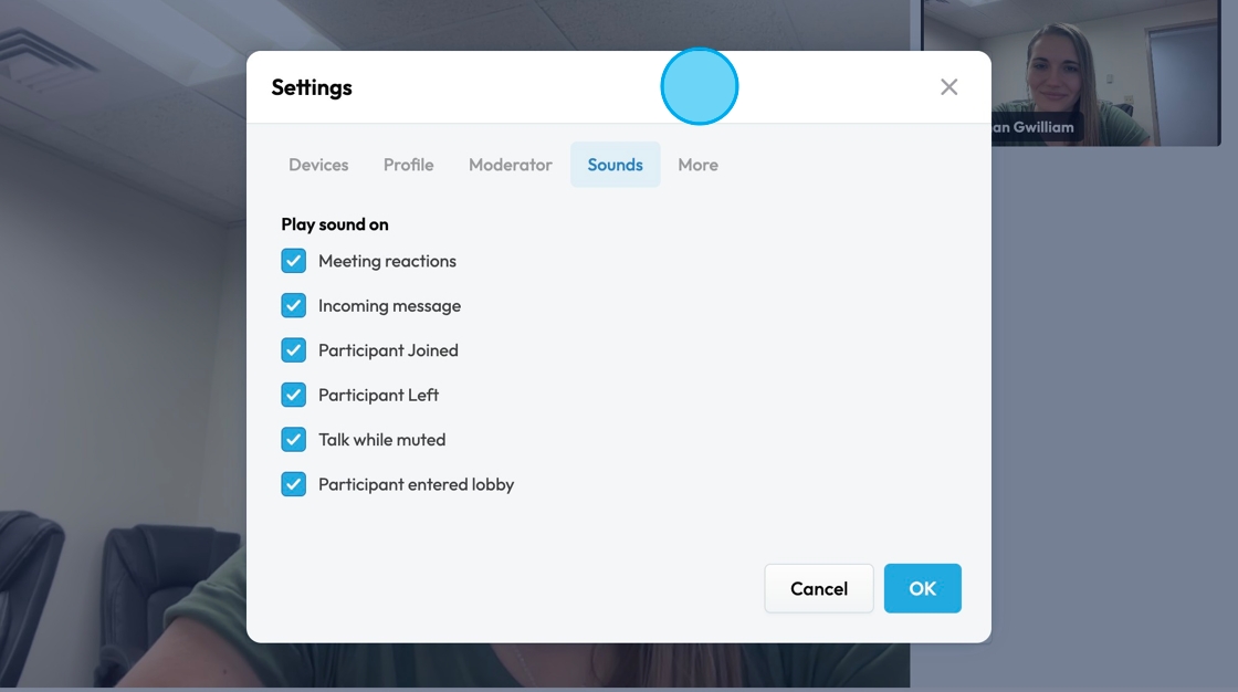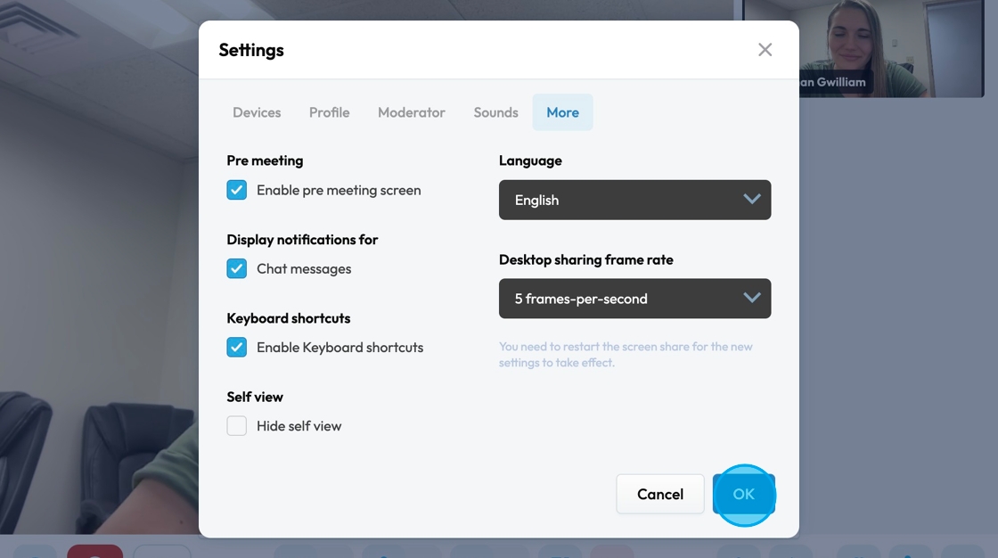 27. "More" allows you to adjust the pre-meeting screen, display notifications, keyboard shortcuts, self view, language of the recorder, and desktop sharing frame rate. Select "OK" to save changes
