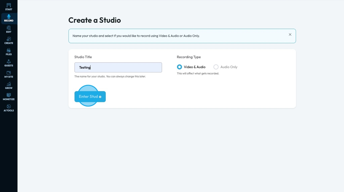You can select "Video & Audio" or "Audio Only". If you select audio only, your studio will not record any video