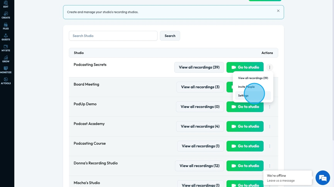 7. The 3 dots under actions will allow you to view all recordings, invite people to the studio, and open settings for that specific studio