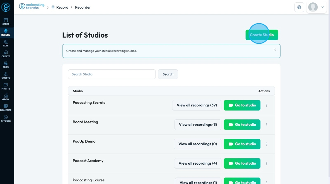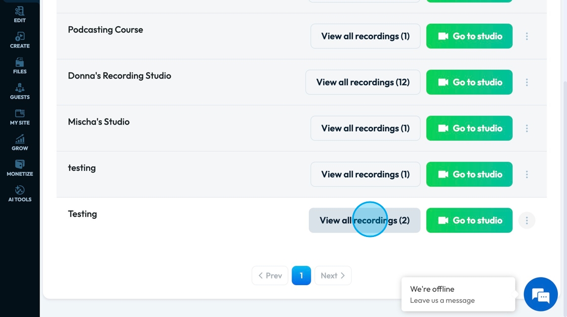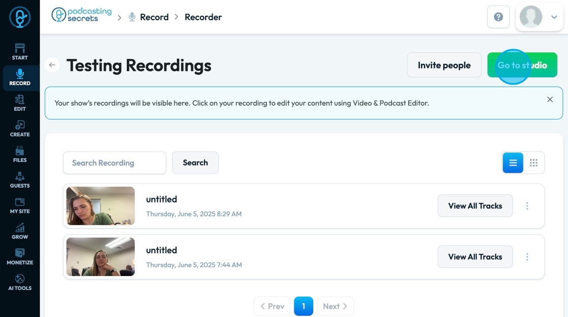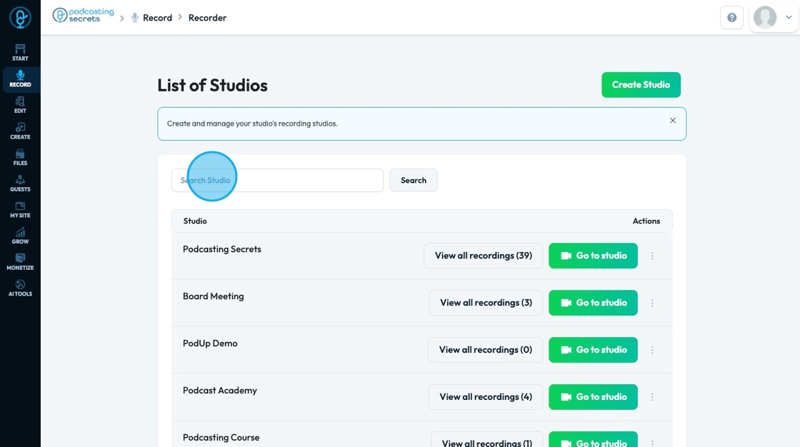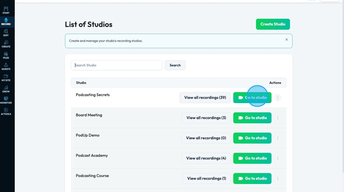 6. Click "Go to studio" to enter the studio or "View all recordings" to view the recordings from that specific studio