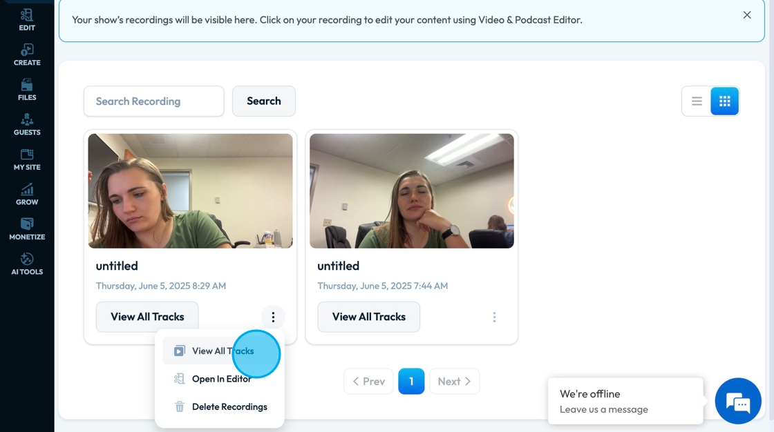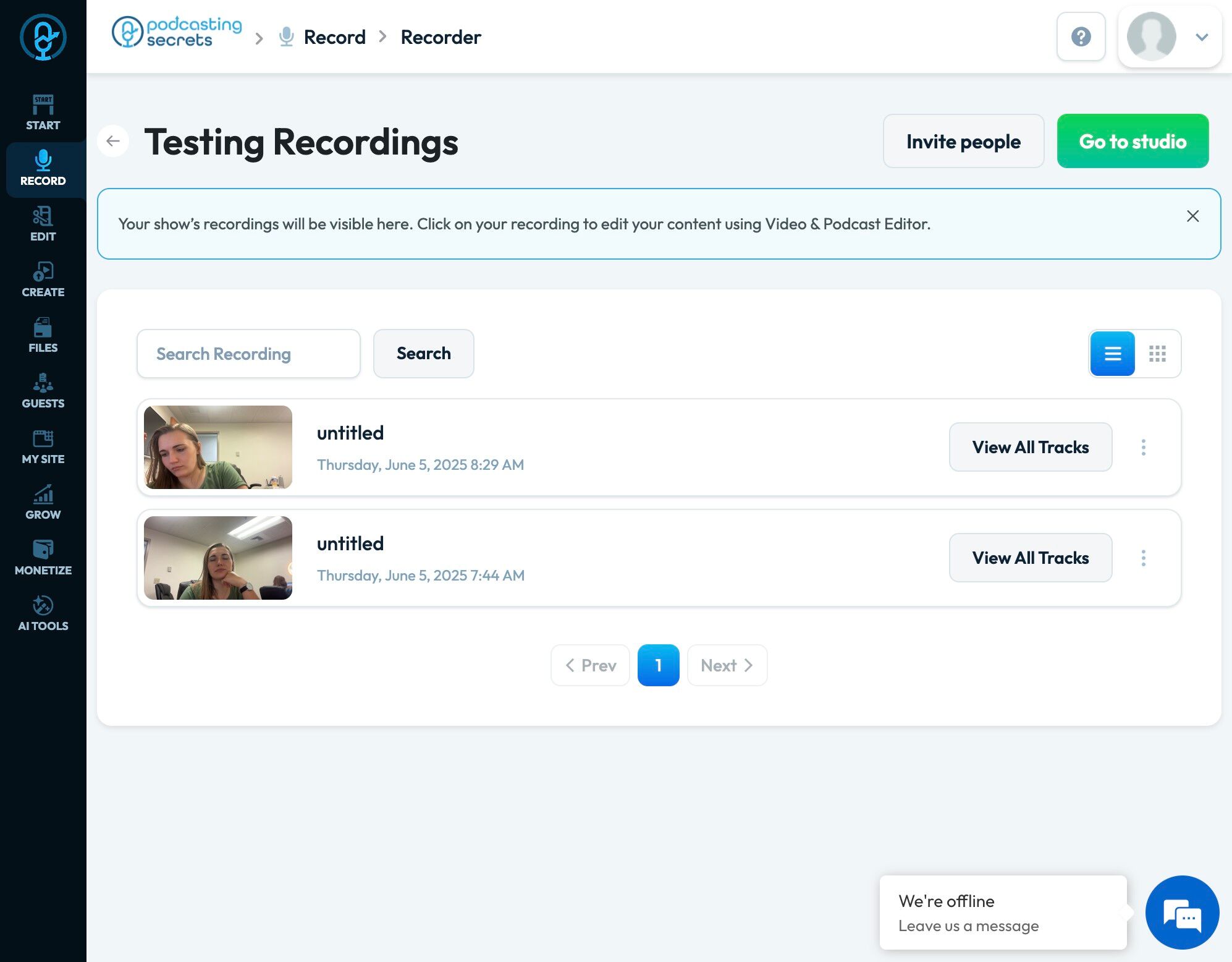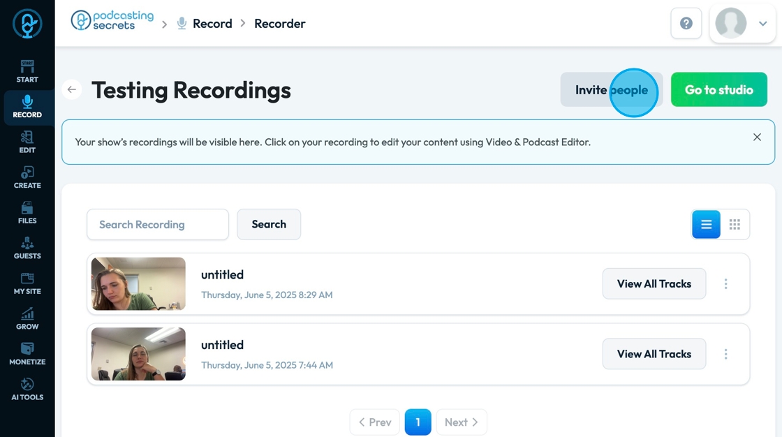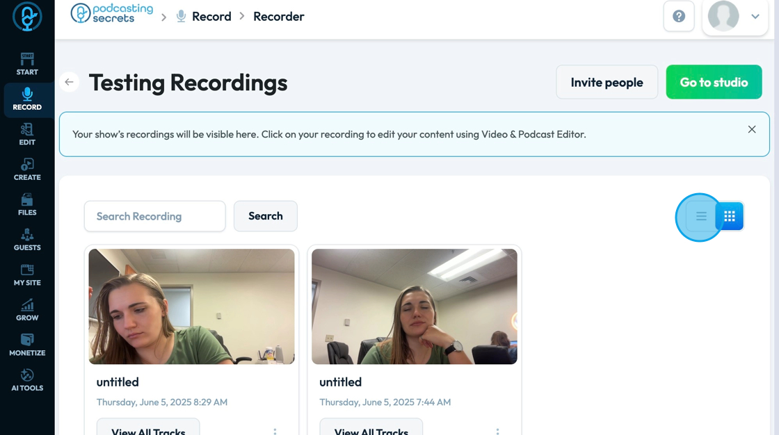 6. Click "Go to studio" to enter the studio or "View all recordings" to view the recordings from that specific studio