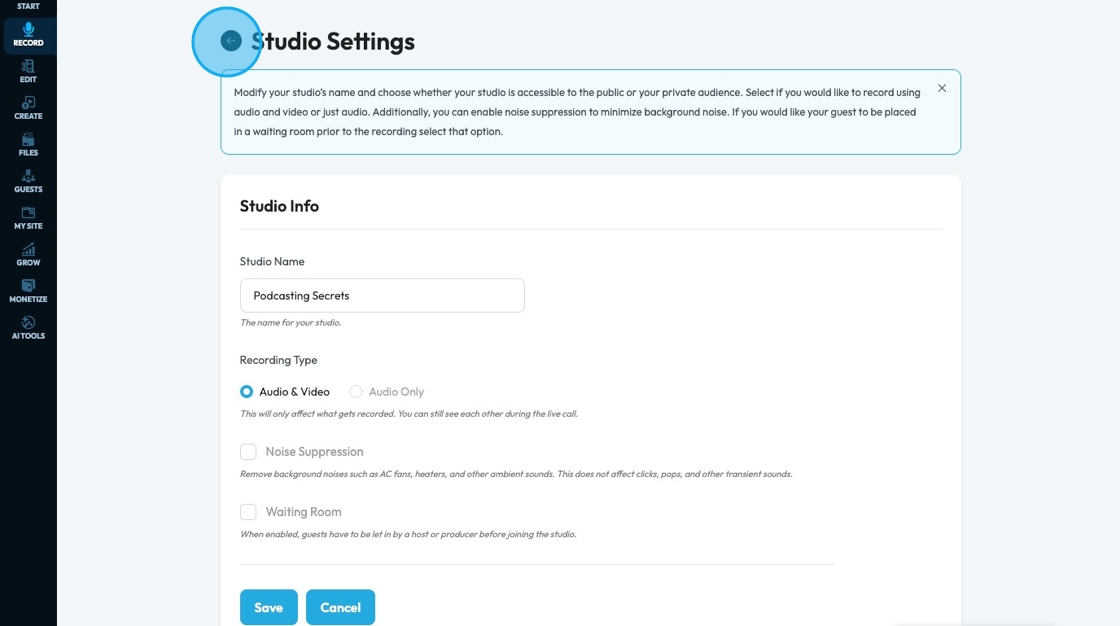 8. "Studio Settings" allows you to change the studio name, adjust the recording type, suppress background noise, and have a waiting room. Click "Save" to keep the changes that you made