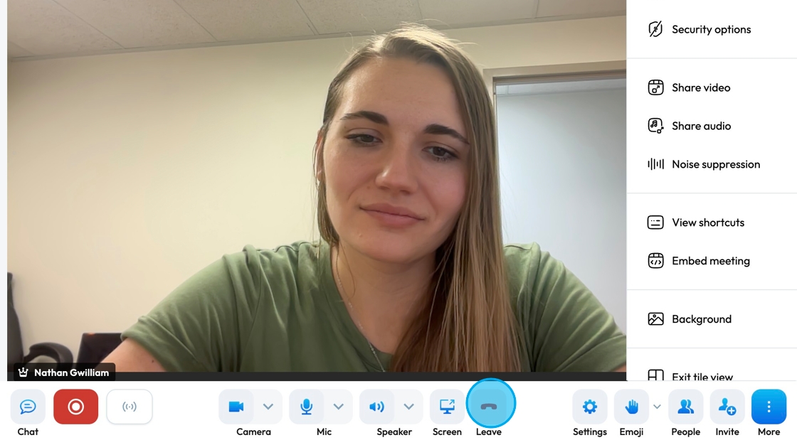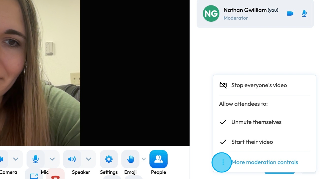 The 3 dots in the bottom right-hand corner allow you to stop everyone's video as well as authorize the attendees to unmute themselves and start their video. The "More moderation controls" will lead you to the "Moderator" section of "Settings" *See step 25