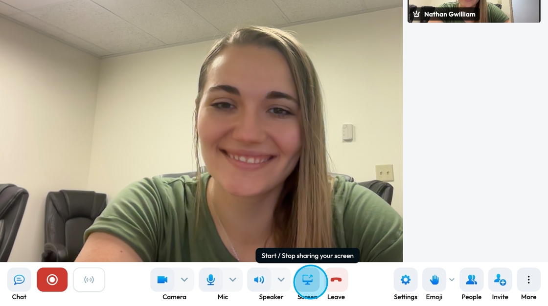 21. Share your screen by selecting the "Screen" icon at the bottom. A pop-up will appear to allow you to select the window you want to share