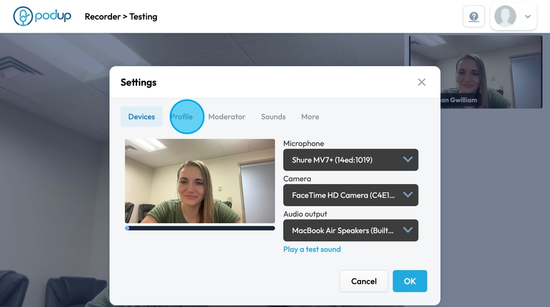 23. "Devices" shows you your current microphone, camera, audio output, and a thumbnail of what your image looks like. The drop-down bar for each category can be selected to change the setting. Select "OK" to save changes.