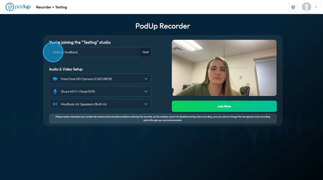 11. Once you enter the studio, you need to add your name and select the camera, microphone, and speaker that you want to use. Click "Join Now" to enter the Recorder