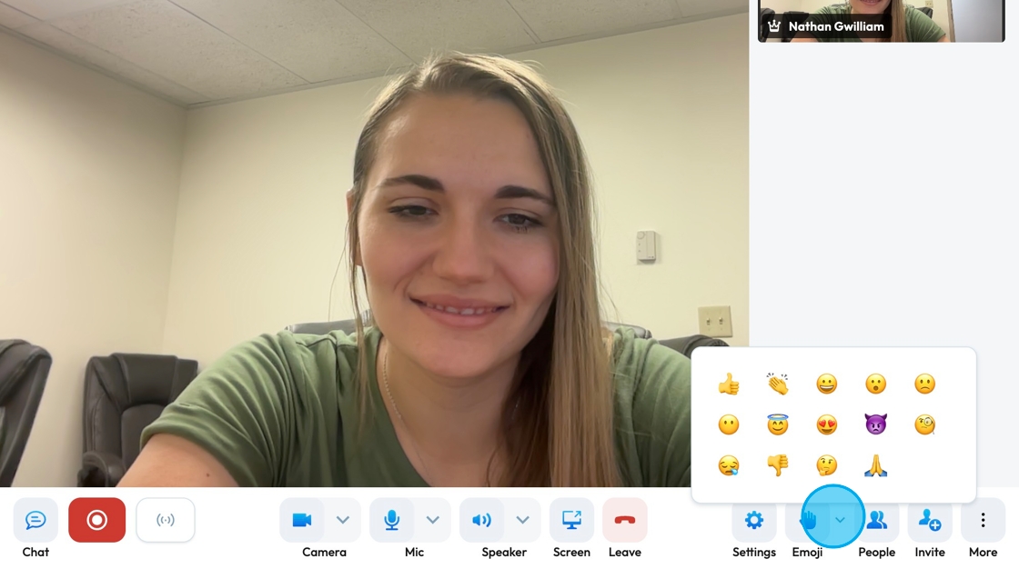 28. Click "Emoji" to send a hand raise or reaction to your guest in the studio