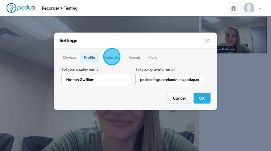 24. "Profile" shows your display name and your gravatar email. You can change both by selecting the desired field and typing in your preferred name and email. Select "OK" to save changes