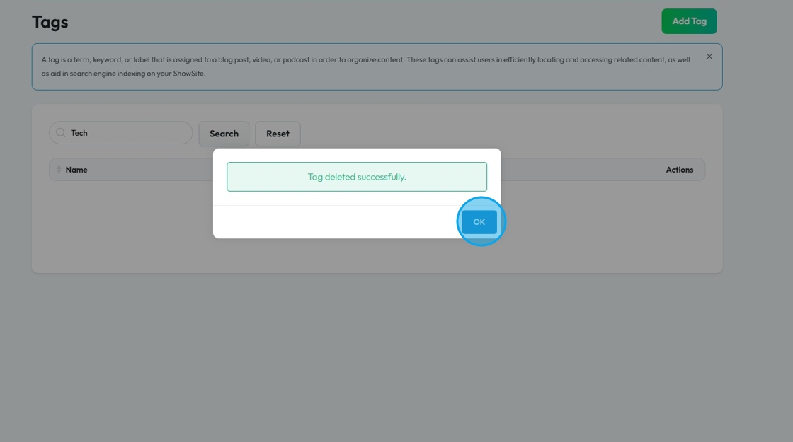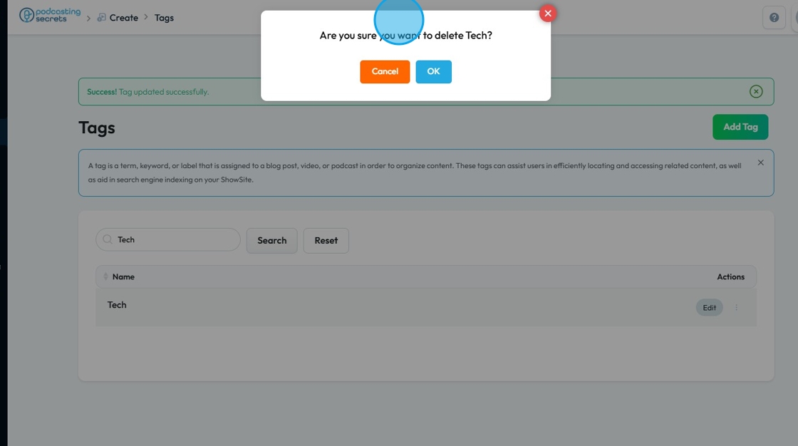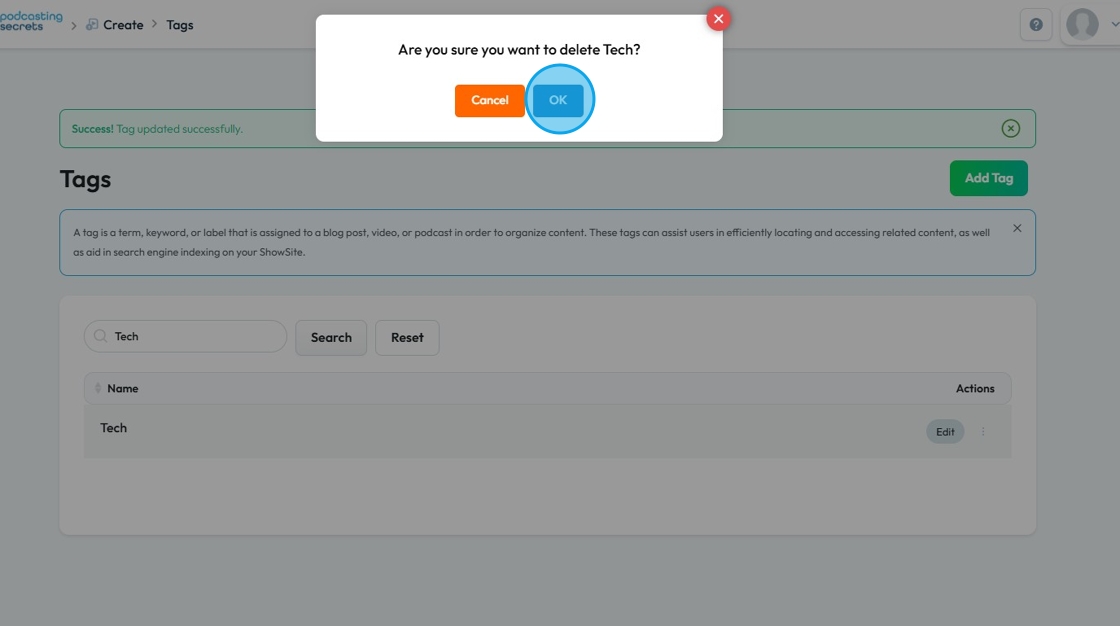 22. "Tag deleted successfully" message will appear on the screen, just click "OK" to remove it
