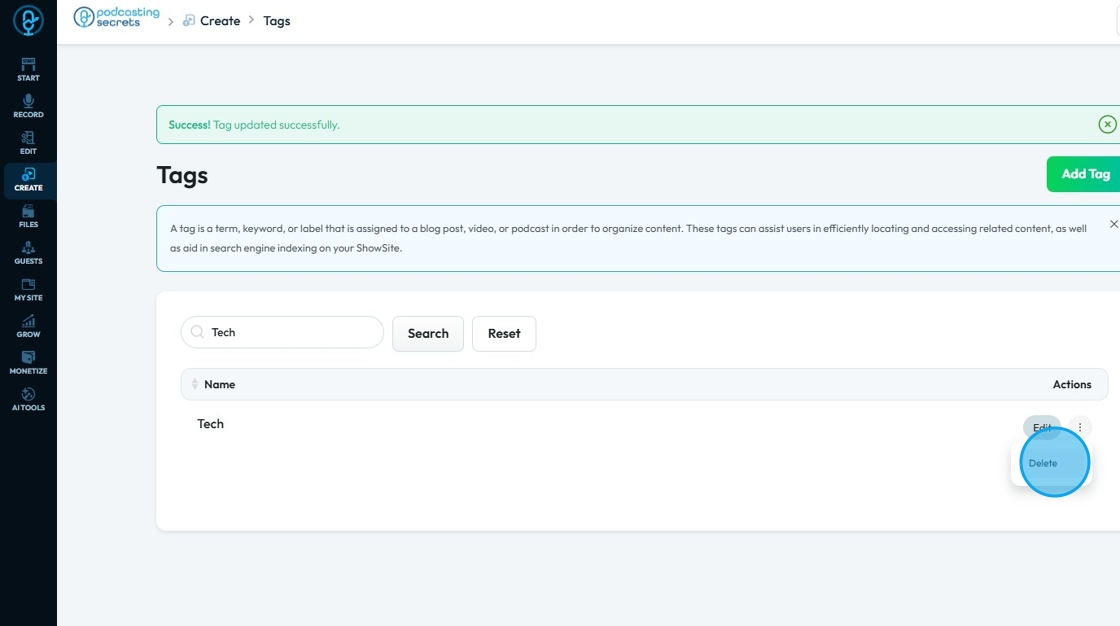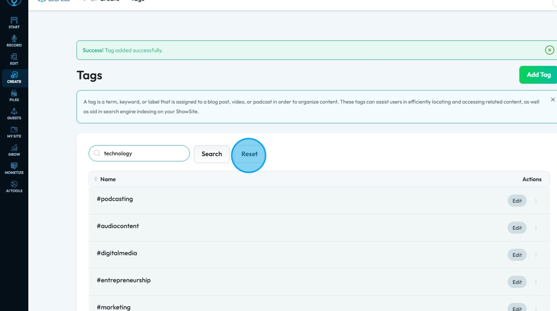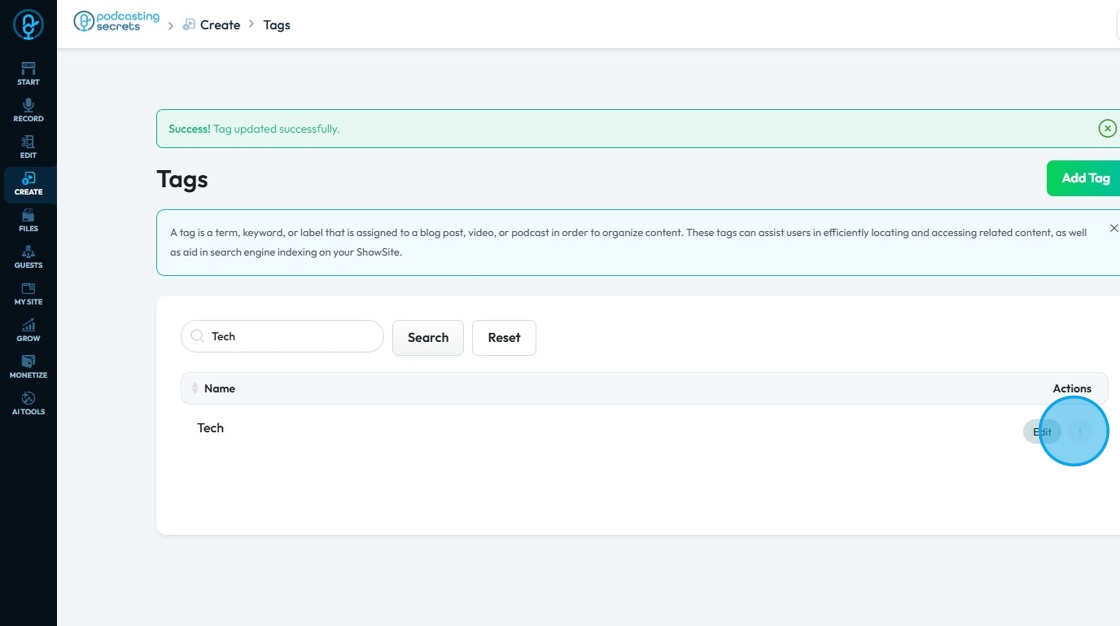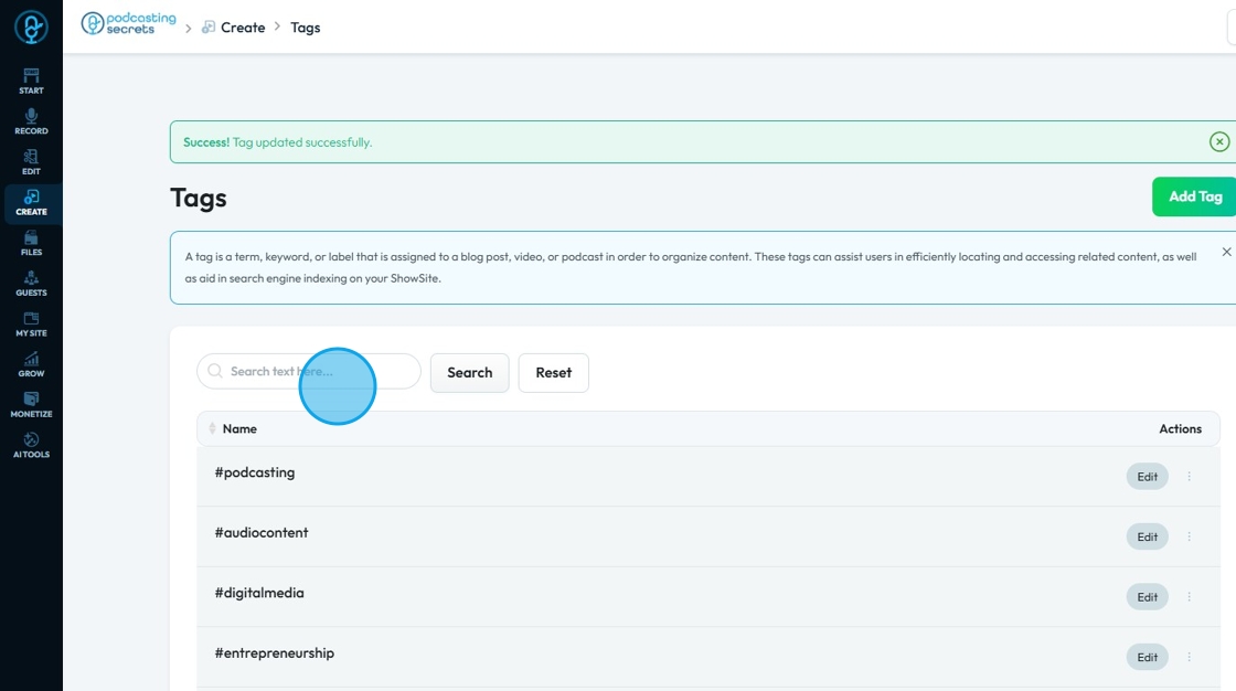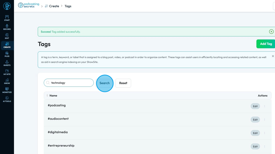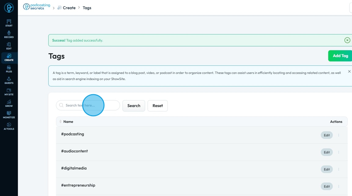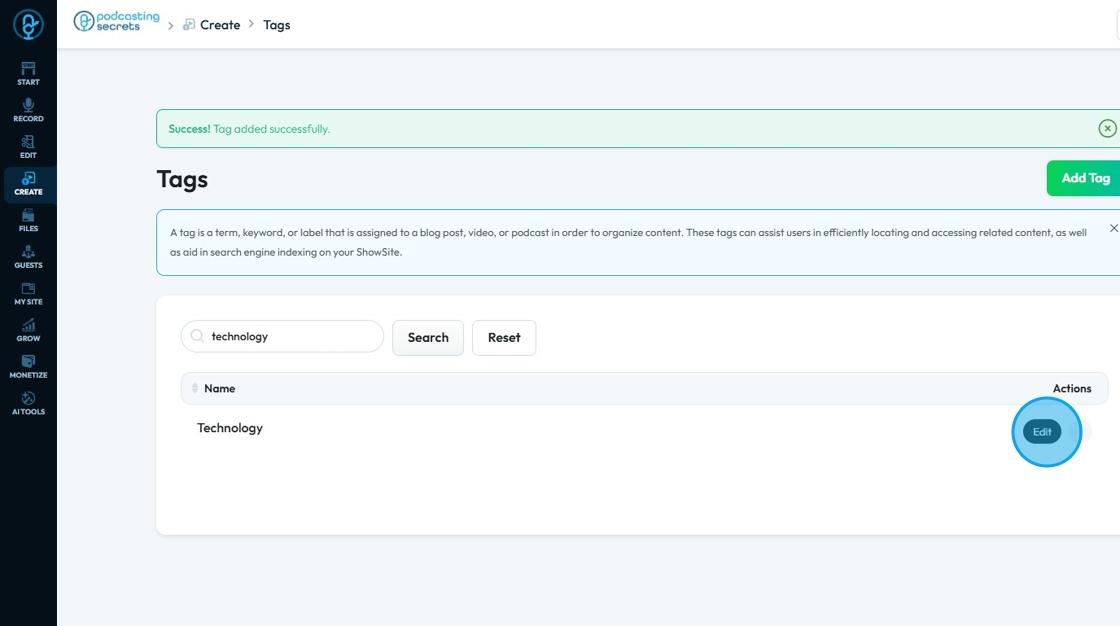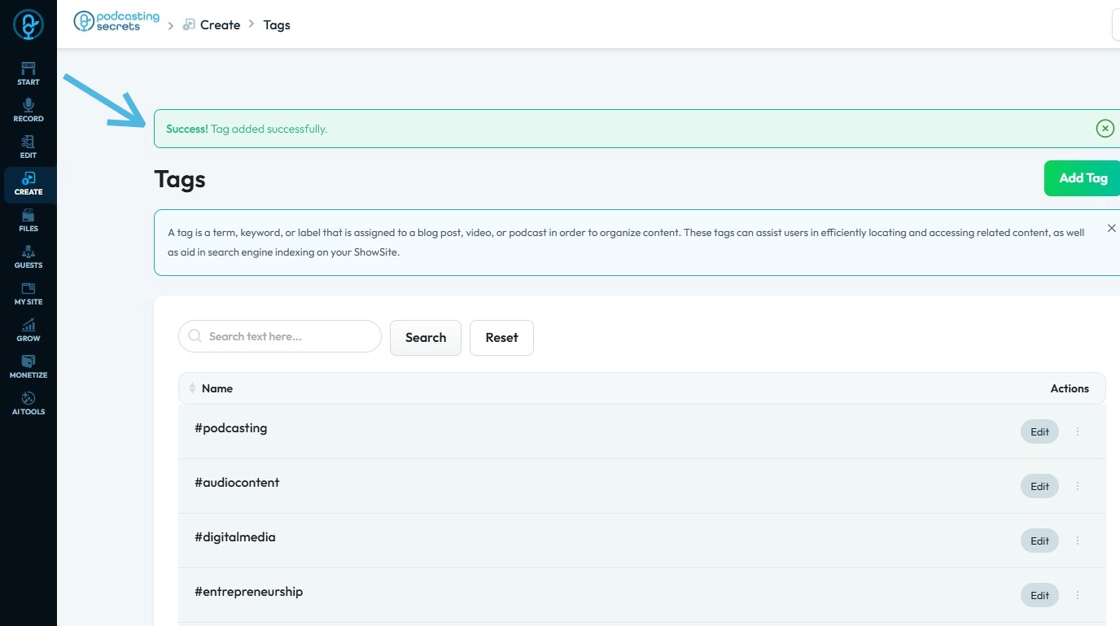 7. Once the tag is saved, a "Success! Tag added successfully" message will appear