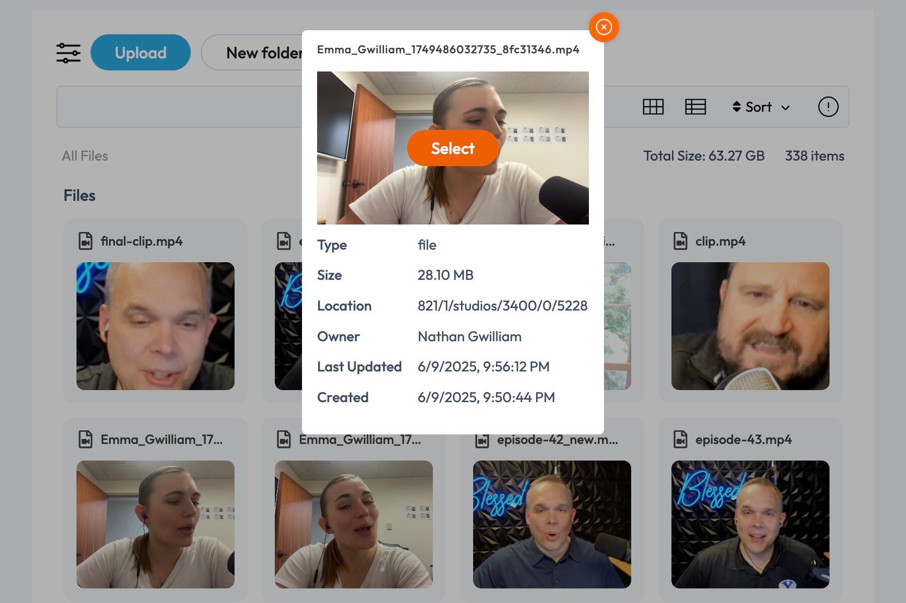 9. A popup will appear where you can upload a video from your computer or select a video that is already in PodUp