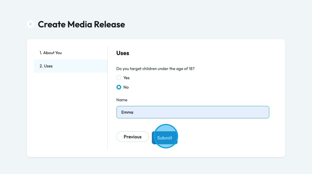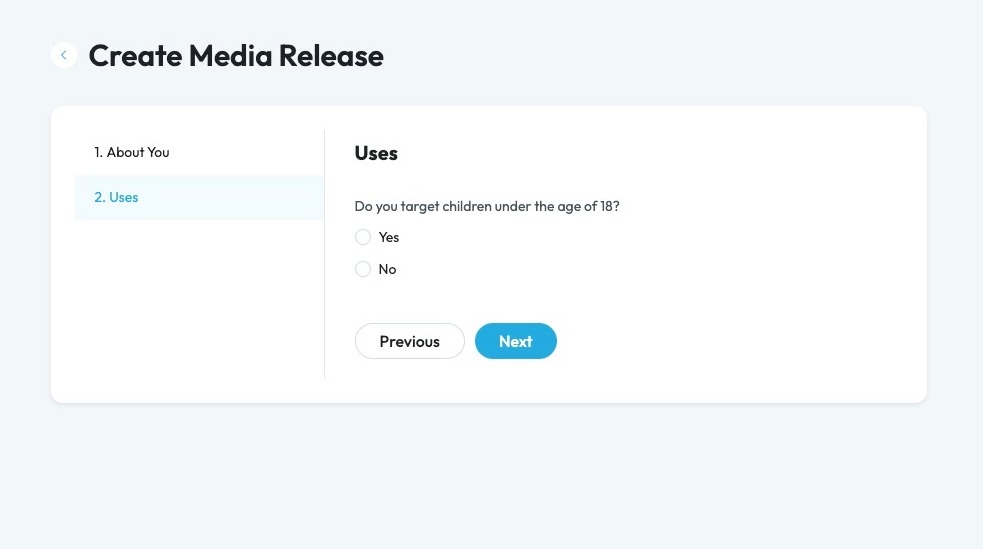 10. Click "Yes" or "No" based on if you target children under the age of 18, meaning that your media release allows you to share media of someone under the age of 18