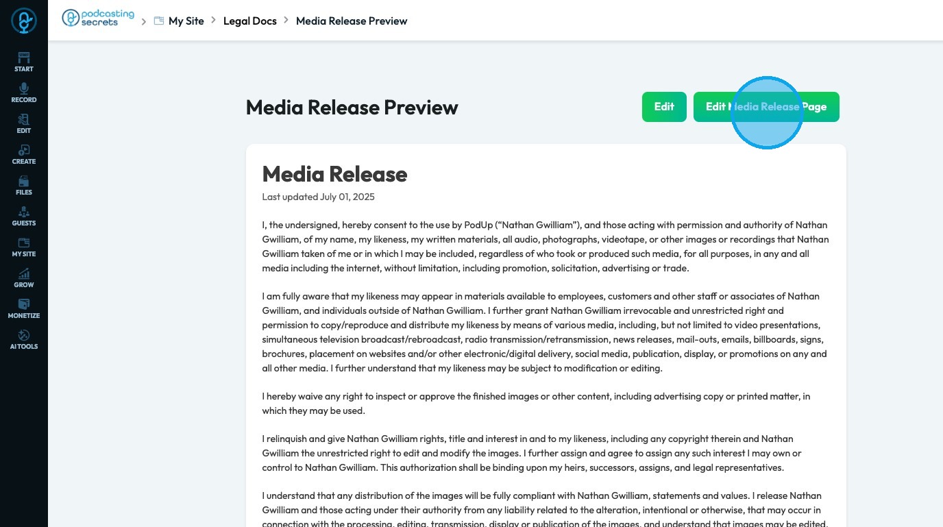 14. Click "Edit Media Release Page" to edit the media release on the website itself
