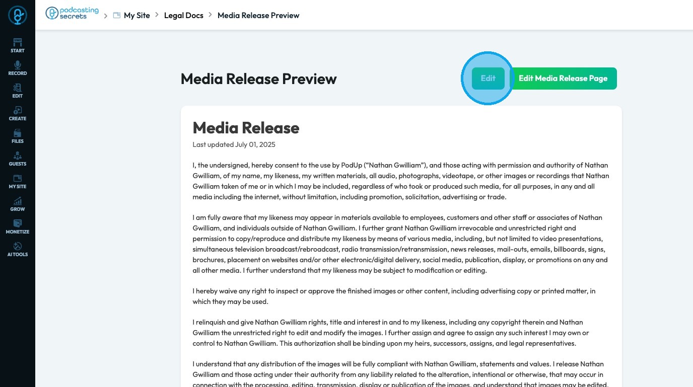 13. Click "Edit" to edit the media release