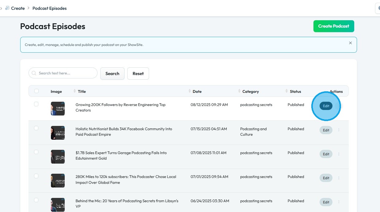 4. Click “Edit” next to the podcast for which you want to update the podcast art and description