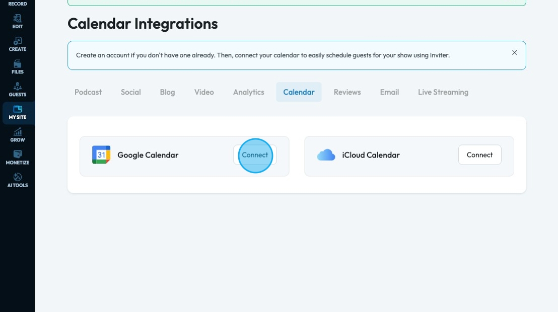 Connecting your calendar means that things you input in your PodUp calendar like a scheduled recording will be put in your Google or iCloud calendar