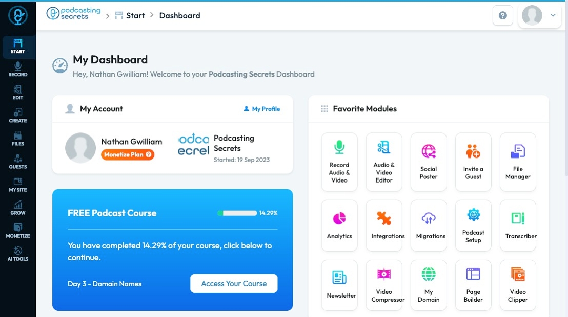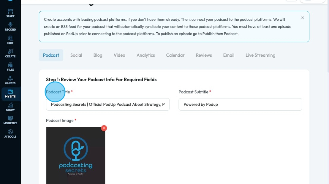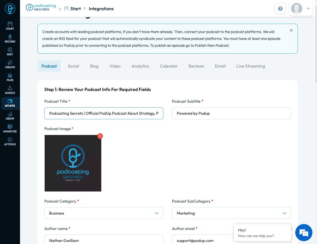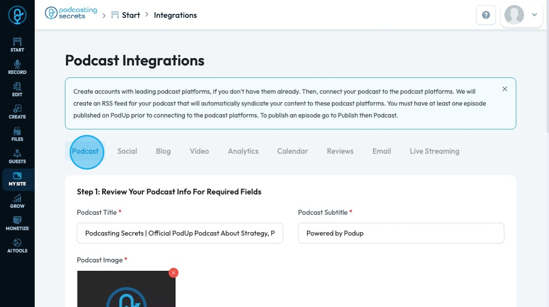 5. The "Podcast Integrations" page will open to Podcast so you can edit your podcast info before integrating all of your social media accounts