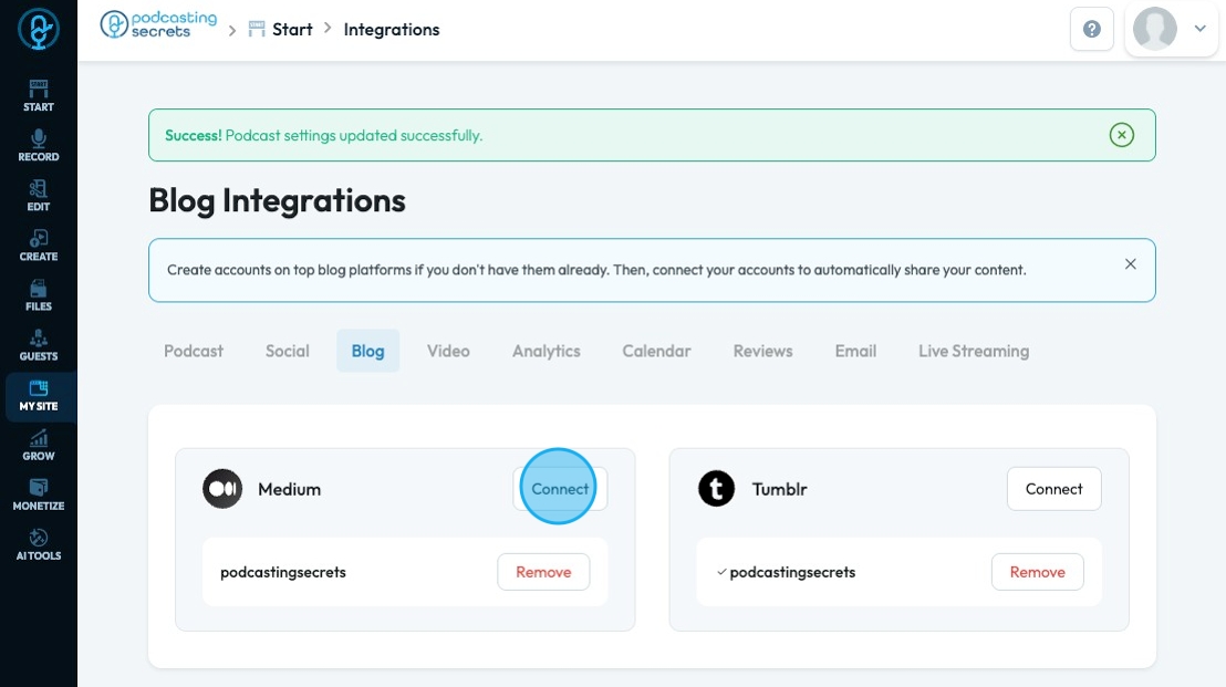 23. Connect blog platforms under the "Blog" tab. PodUp currently offers 2 blog platforms. Click "Connect" for detailed instructions on how to connect PodUp to these platforms.