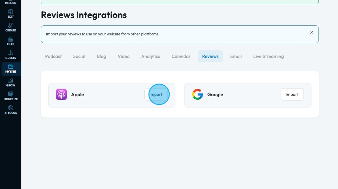 27. Connect your reviews under the "Reviews" tab. PodUp currently offers 2 review platforms. Click "Import" to be led to a popup that will guide you through the import. Once you have finished click "Save".