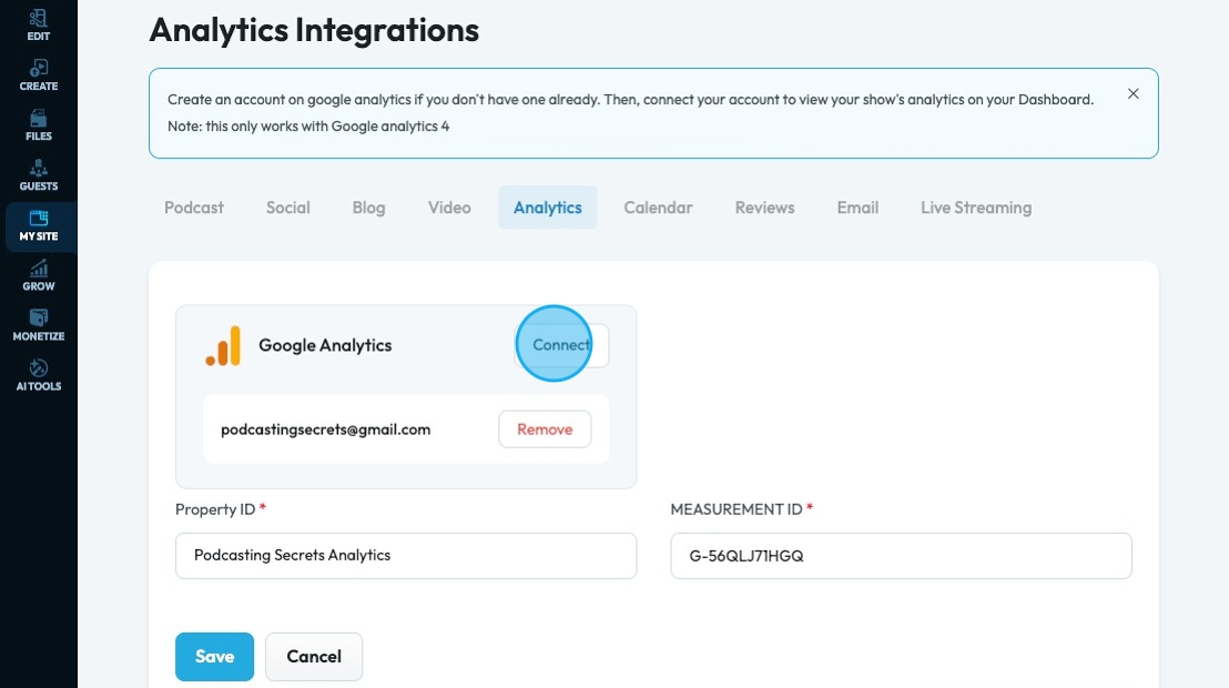 25. Connect Analytics under the "Analytics" tab. PodUp currently integrates with Google Analytics. Click "Connect" to connect with Google Analytics.