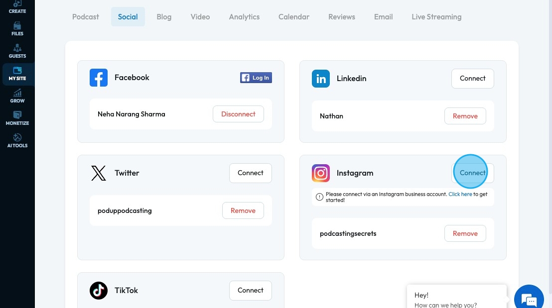 22. Connect Social Channels under the "Social" tab. PodUp currently offers 5 social Channels. Click "Connect" to open a pop-up menu to connect your social media account to your PodUp account