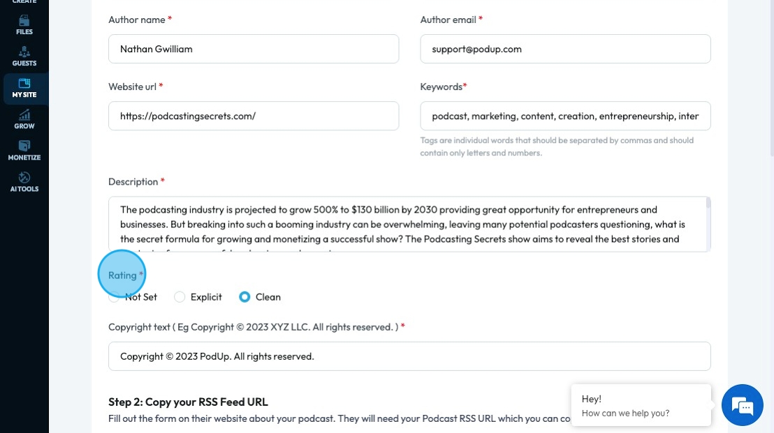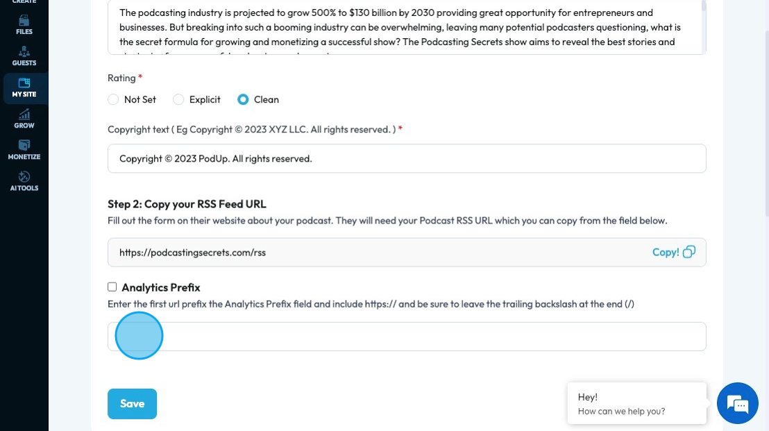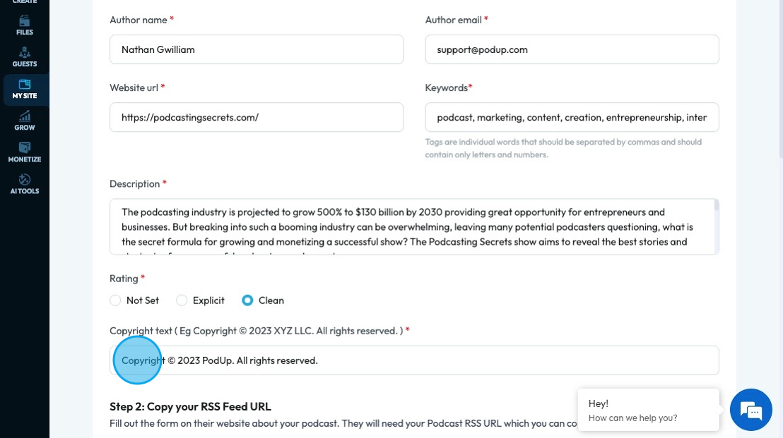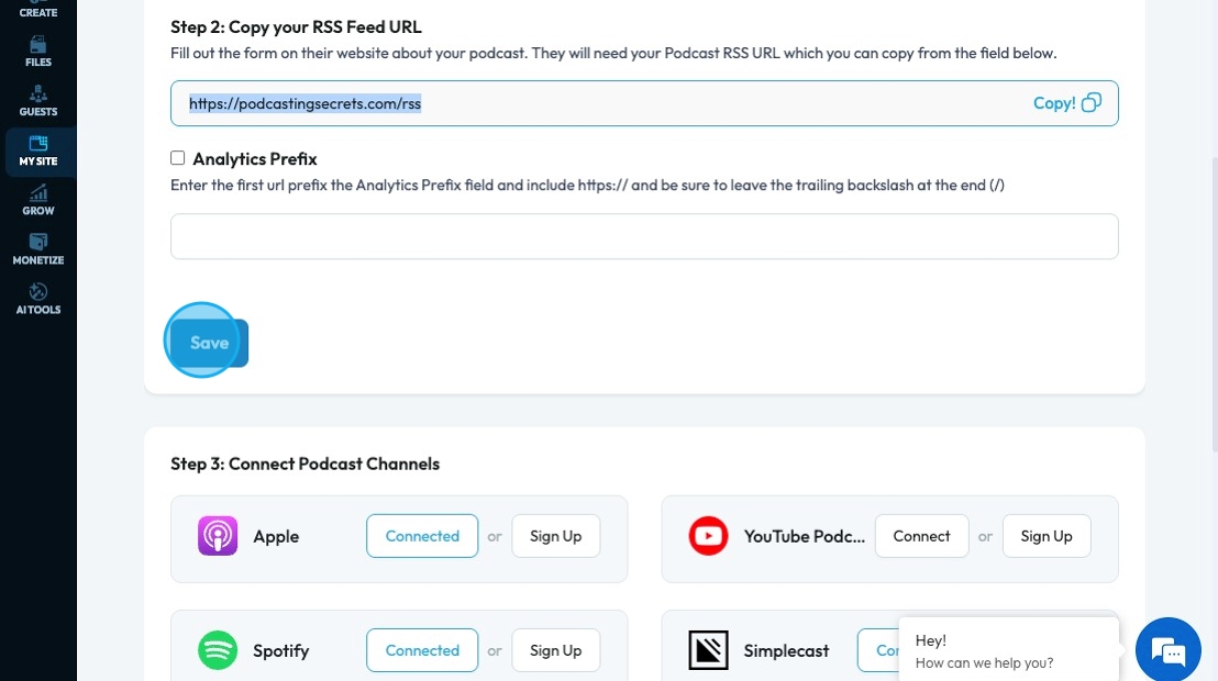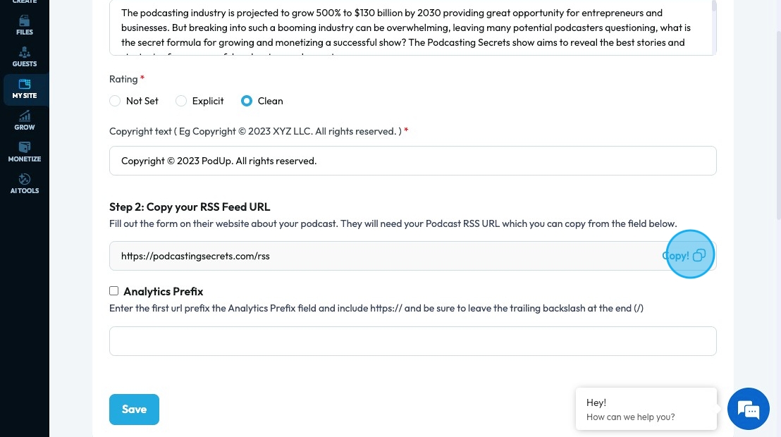 18. Click "Copy" to copy your RSS Feed URL which can then be used to integrate your podcast