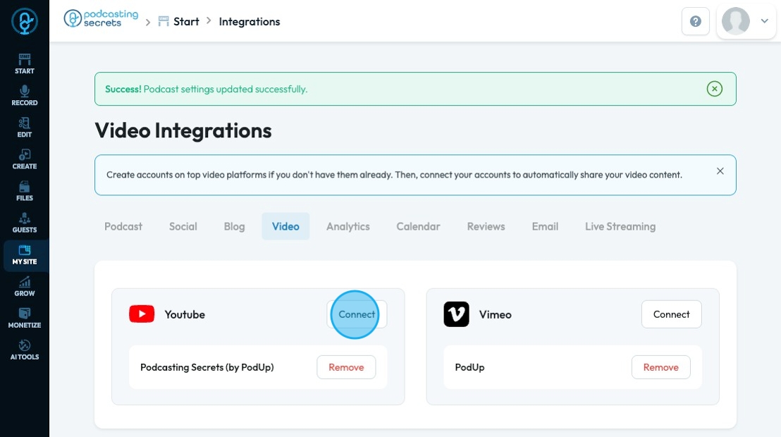 24. Connect video platforms under the "Video" tab. PodUp currently offers 2 video platforms. Click "Connect" to be led to a popup that will guide you through logging in to your account.