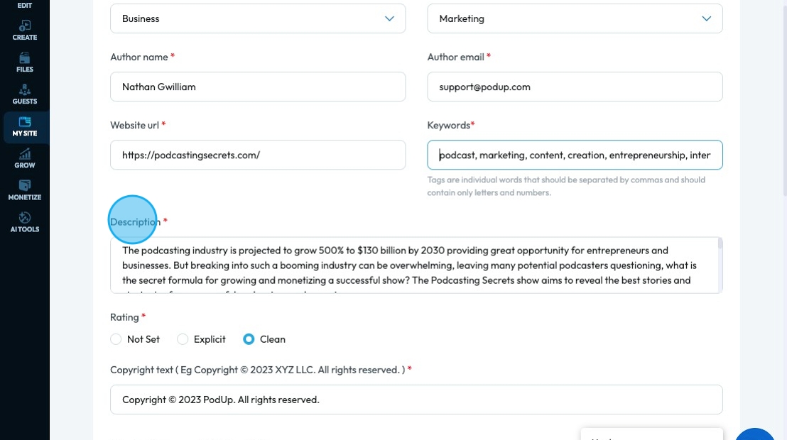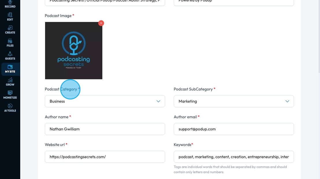 9. Click "Podcast Category " to select the topic category of your podcast from a drop-down menu