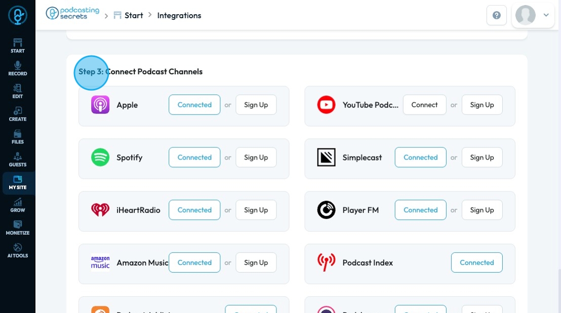 21. Connect Podcast Channels in step 3. PodUp currently offers 15 different channels. This can be done in 1 of 2 ways