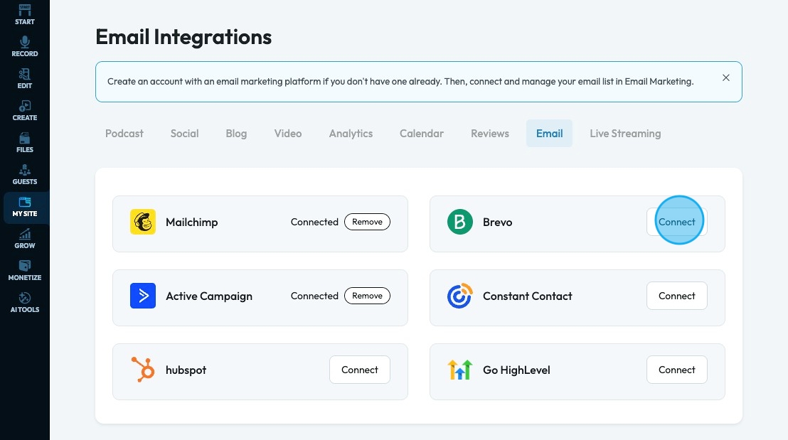 28. Connect email marketing platforms under the "Email" tab. PodUp currently offers 6 email marketing platforms. Click "Connect" to be led to a popup that will guide you through logging in to your account.