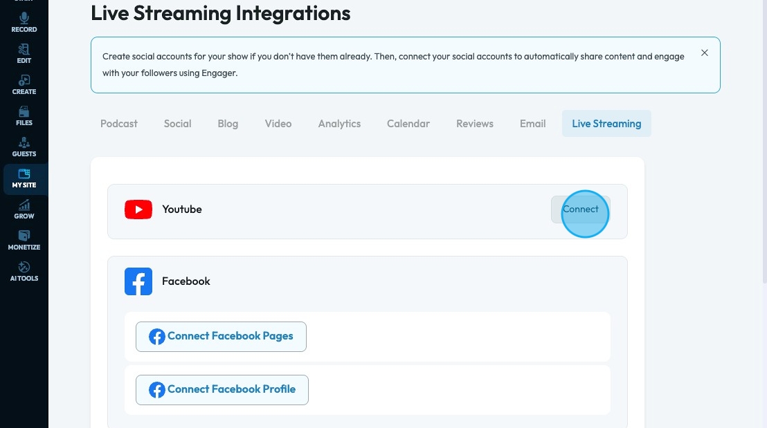 29. Connect social accounts with live stream capacity under the "Live Streaming" tab. PodUp currently offers 8 social accounts with live stream capacity. Click "Connect" to be led to a popup that will guide you through logging in to your account.
