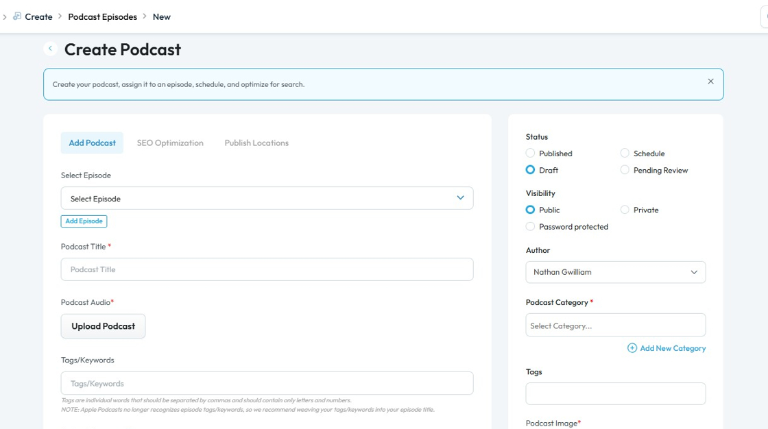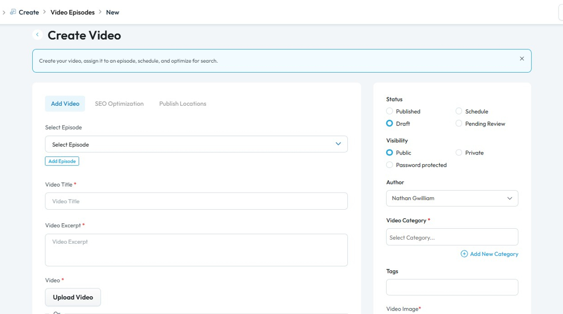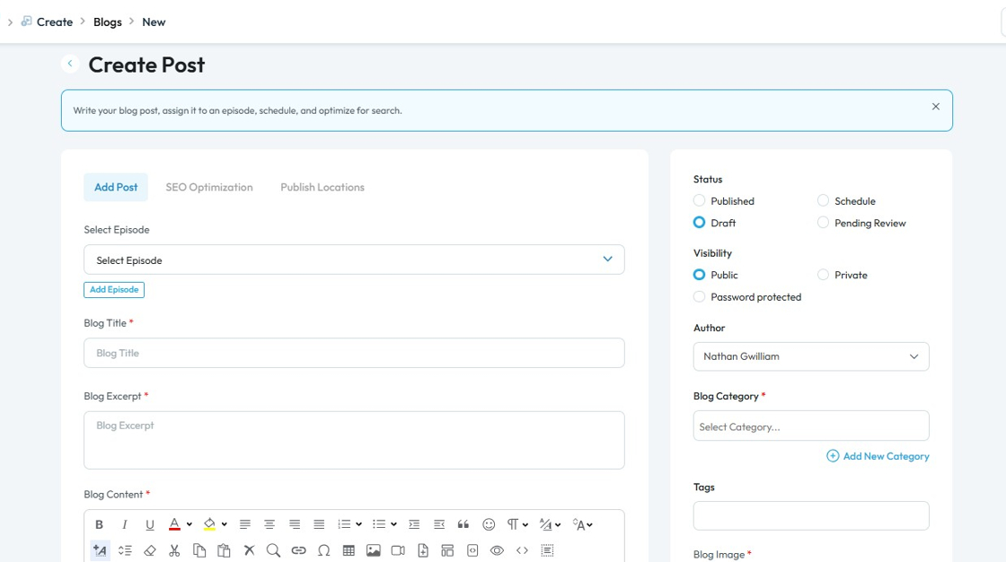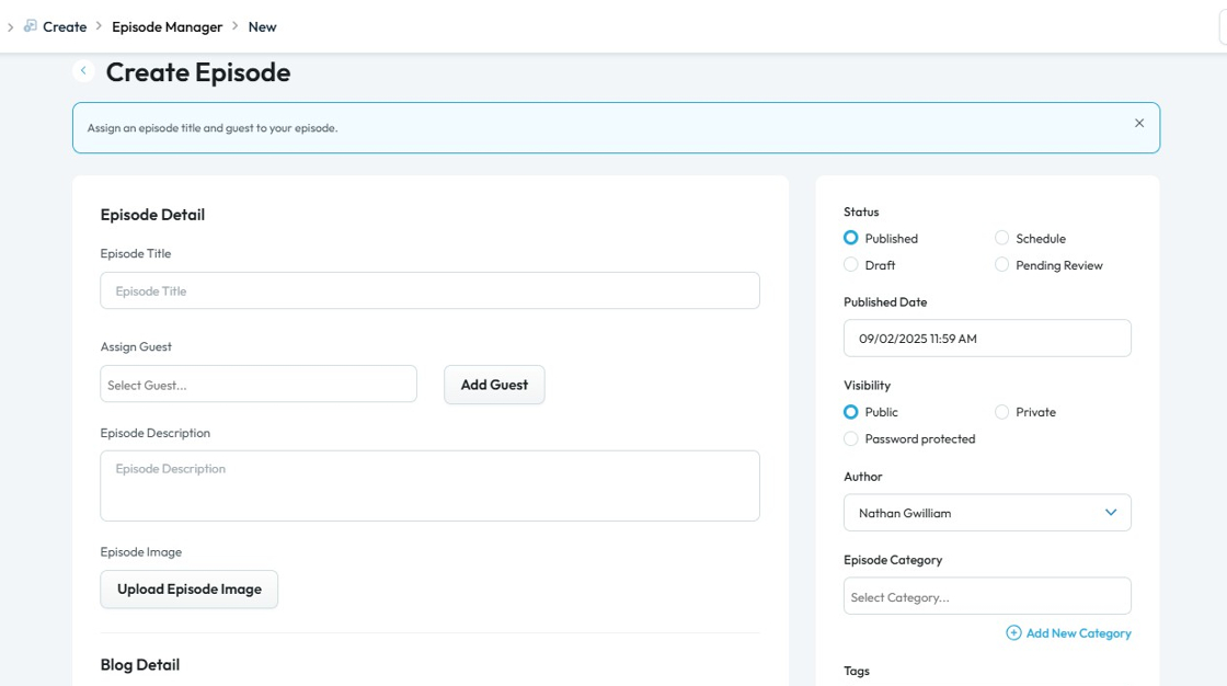 Each blog can be assigned to a specific episode, making it easy to organize blog posts within an episodic structure. Scheduling, author selection, and visibility controls are available to manage publishing workflows.