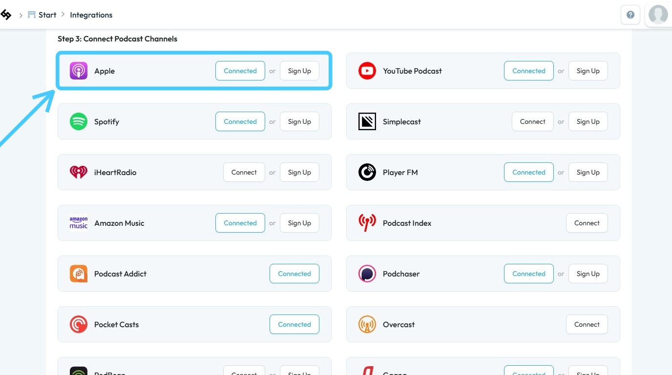 6. Distribution Not Activated: Confirm that Apple Podcast integration is enabled in your PodUp account. Simply publishing your podcast on PodUp does not automatically send it to Apple Podcasts; you must have Apple Podcasts integrated in PodUp.