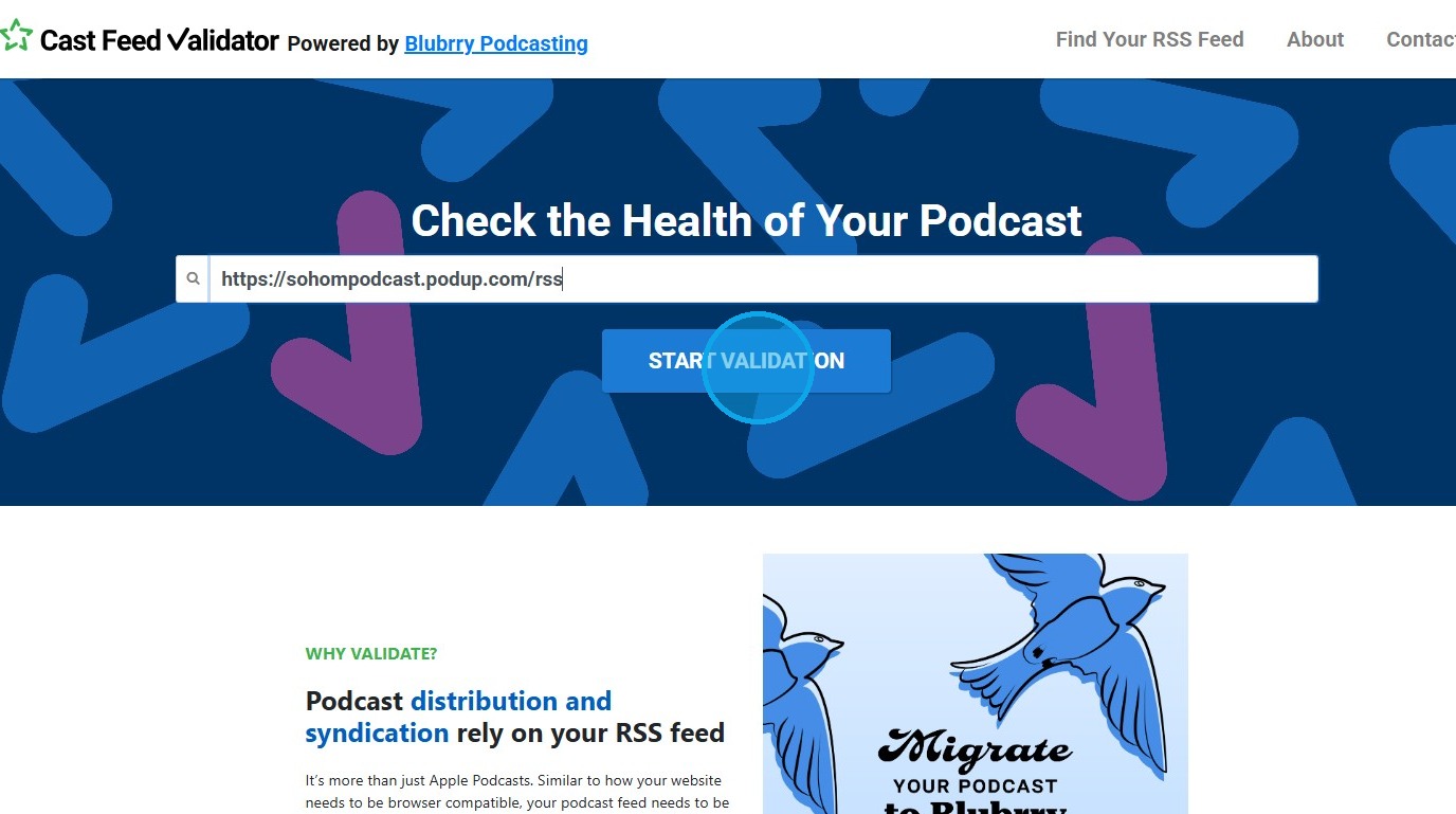 4. Navigate to castfeedvalidator.com and paste the "RSS" link, then click "START VALIDATION"